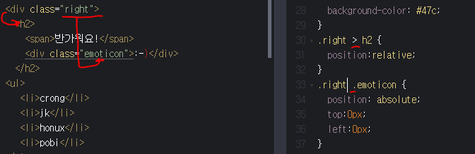- 특별한 위치에 배치하기 위해서는 position absolute를 사용하고, 기준점을 relative로 설정한다.