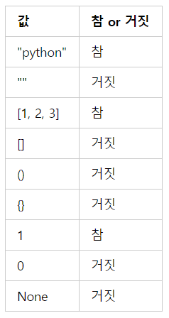 자료형의 참과 거짓을 구분하는 기준은 다음과 같다.