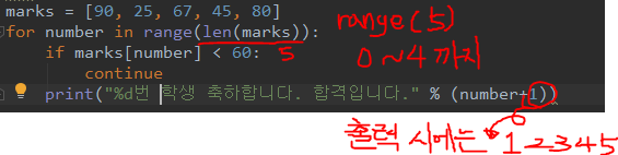 if mark < 60: # 60점 미만인 사람은 continue로 넘어가서 다시 for문으로 돌아간다.