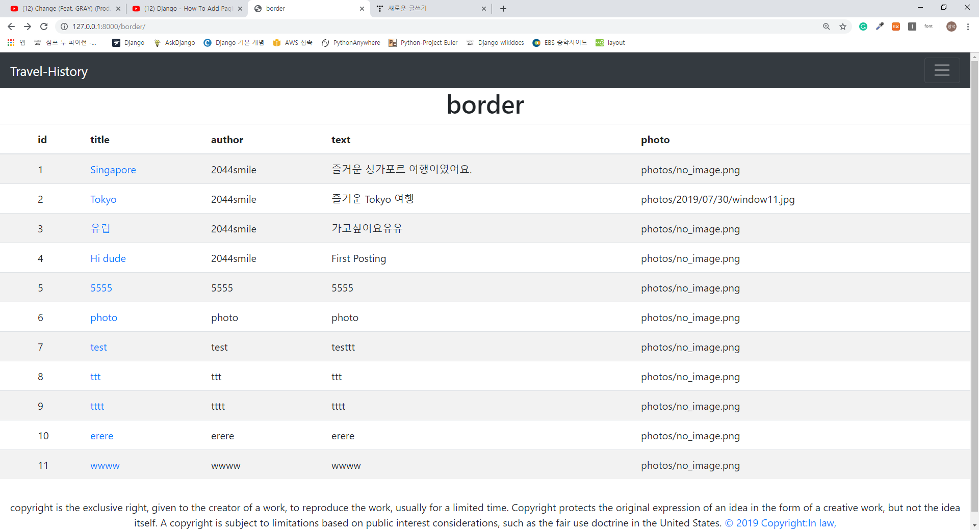 Pagination 을 설정하지 않은 상태이다. 게시물은 11개가 생성되어있고, Pagination을 설정하기 전이다.