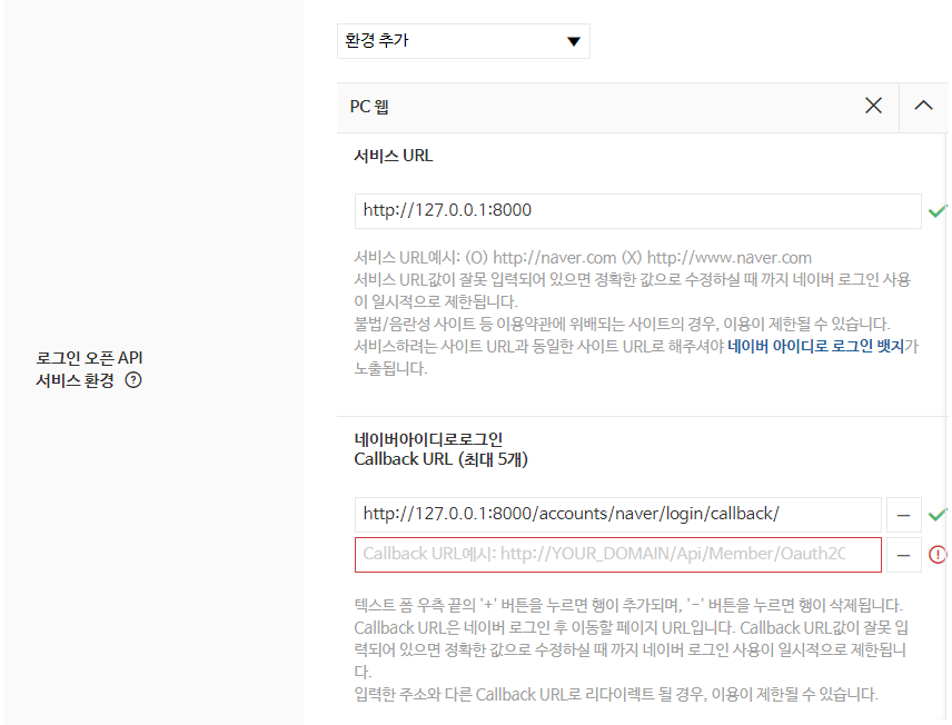 Callback url은 각 서비스마다 다르니 allauth 문서를 참조하면 된다.