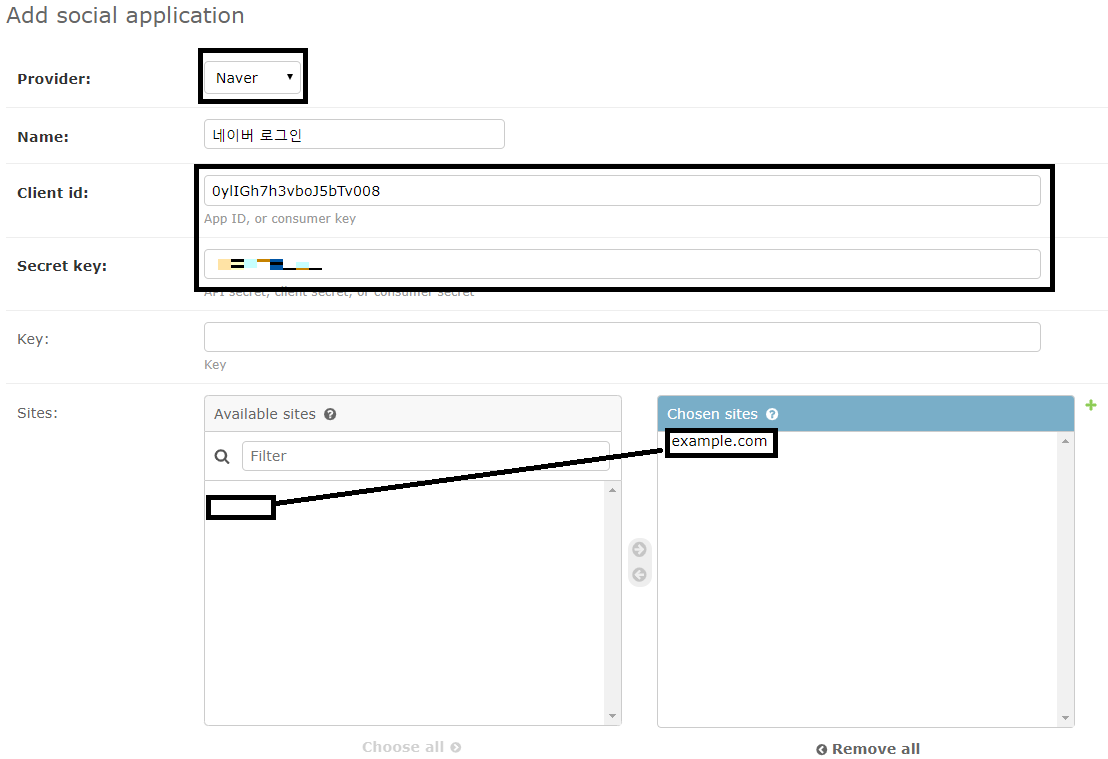 등록버튼을 누르면 아래와 같은 정보가 나온다. 이 정보를 Django 관리자 페이지에서 등록하면 절차가 끝난다.