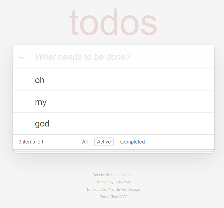 index 뷰는 list.html만 렌더링해서 보여주는 역할을 합니다. 실제 화면은 프론트 코드가 모두 로드된 후에 Vue.js가 화면을 렌더링 합니다. 그리고 데이터를 주고 받기 위해 todo_fetch와 todo_save 뷰를 호출하면서 애플리케이션이 동작하는 형태 입니다.