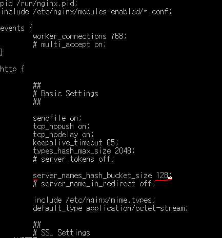 지원하는 도메인 길이를 변경하기 위해 nginx.conf 파일을 수정합니다.