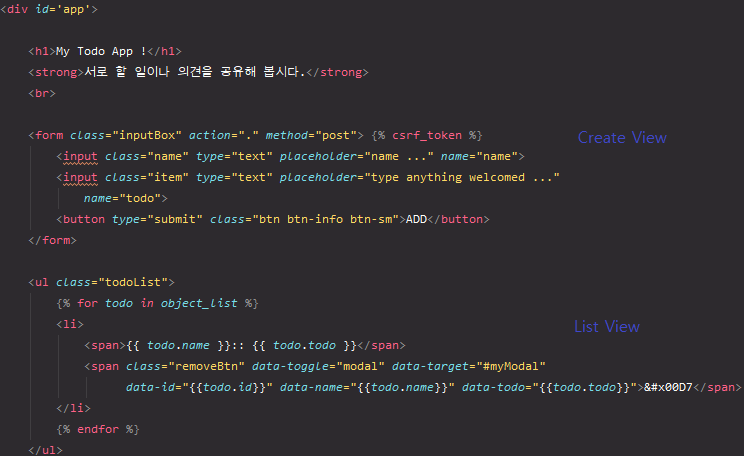 한개의 템플릿 내에 CreateView의 영역이 있고, ListView의 영역이 있다.