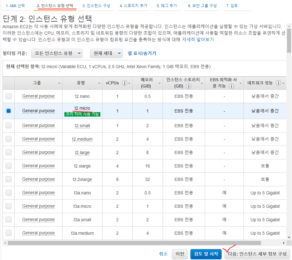 CPU, 메모리, 스토리지, 최적화 및 네트워크 성능 사양을 정할 수 있다. 프리티어 사용자는 t2.micro를 선택하면 1년 동안 주어진 용량 내에서 무료로 사용할 수 있다.