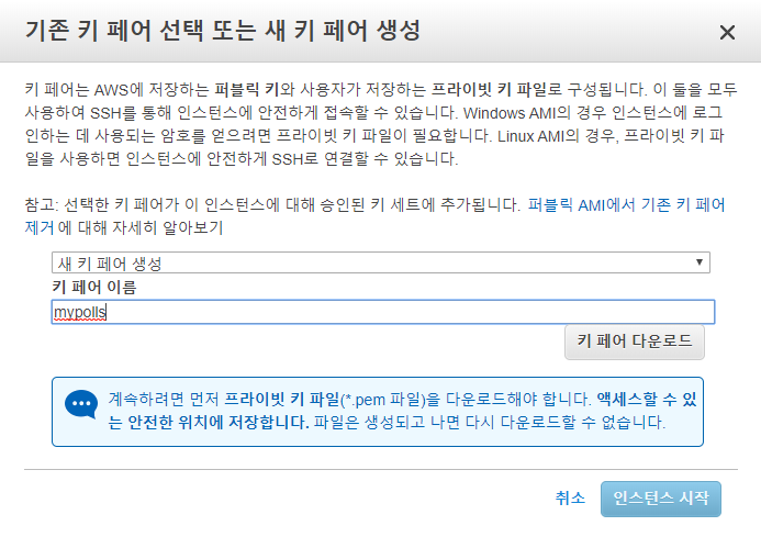 신규로 키 페어를 생성할 경우에는 pem 확장자의 키 페어 파일을 생성하고 다운로드 경로를 제공하며, 다운로드가 완료될 경우에만 인스턴스를 시작한다. 다운로드 된 pem 파일은 보안 유지를 위해서 관리가 잘 되어야 하며, 두 번 이상 다운로드 할 수 없기 때문에 신중한 파일 보관이 필요하다.