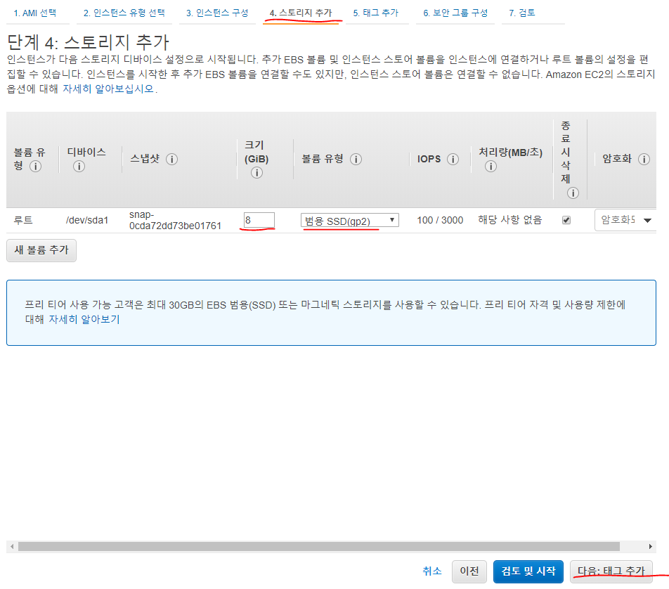 프리티어는 최대 30GB의 EBS 범용(SSD) 규격의 스토리지 사용이 가능하므로 프리티어 사용자는 이 점을 참고하자!
