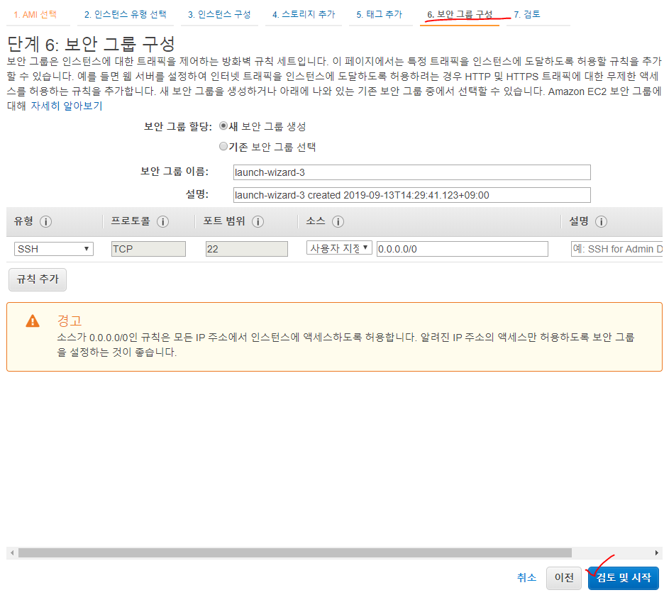 보안 그룹은 특정 PC나 네트워크 대역별로 허용하거나 차단할 보안 유형을 지정할 수 있으며, 기존에 동일한 보안 그룹이 있을 경우 기존 유형을 선택할 수 있다. 반면에 동일한 보안 그룹이 없을 경우에는 신규 보안 그룹을 동시에 생성한다. 보안 그룹은 EC2 인스턴스 생성 이후에도 추가 및 변경이 가능하므로 여기에서는 기본값으로 설정하겠습니다.