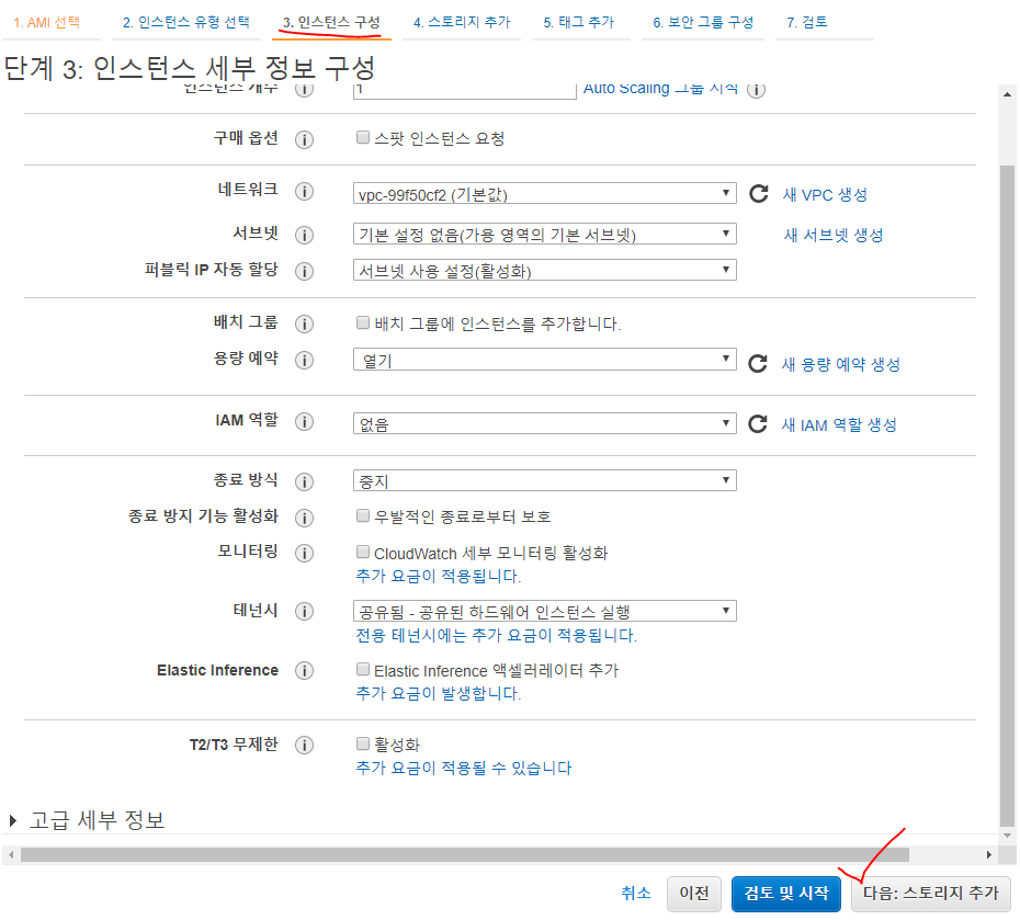 인스턴스 생성을 위한 세부 정보를 입력하는 부분으로, 인스턴스 개수 및 네트워크, 계정 보안 등을 설정할 수 있다.