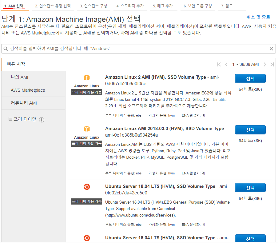 AMI는 운영체제, 애플리케이션 서버, 애플리케이션이 포함된 서버 템플릿으로, 다음과 같이 여러 다양한 서버를 선택할 수 있다.