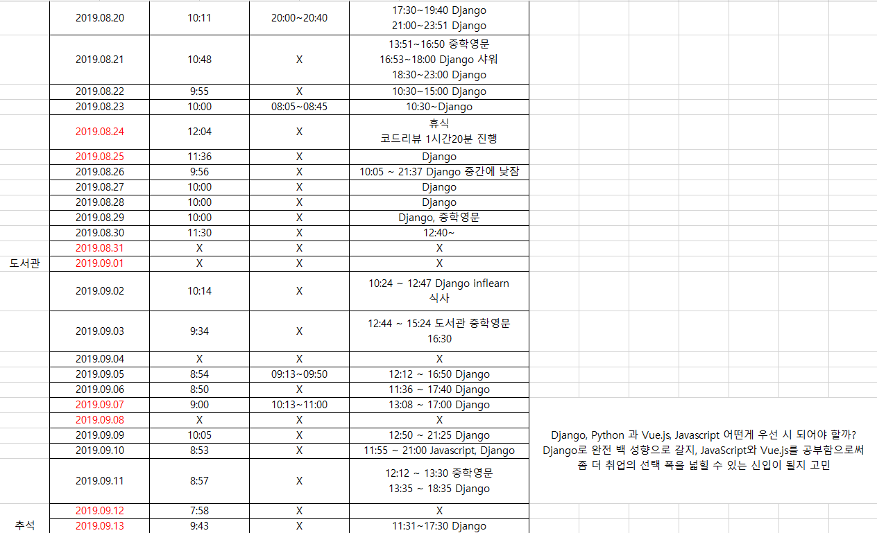 엑셀표로 보이는 사진은 제가 7월부터 지금까지 계속 기록하고 있는 계획 기록표입니다.