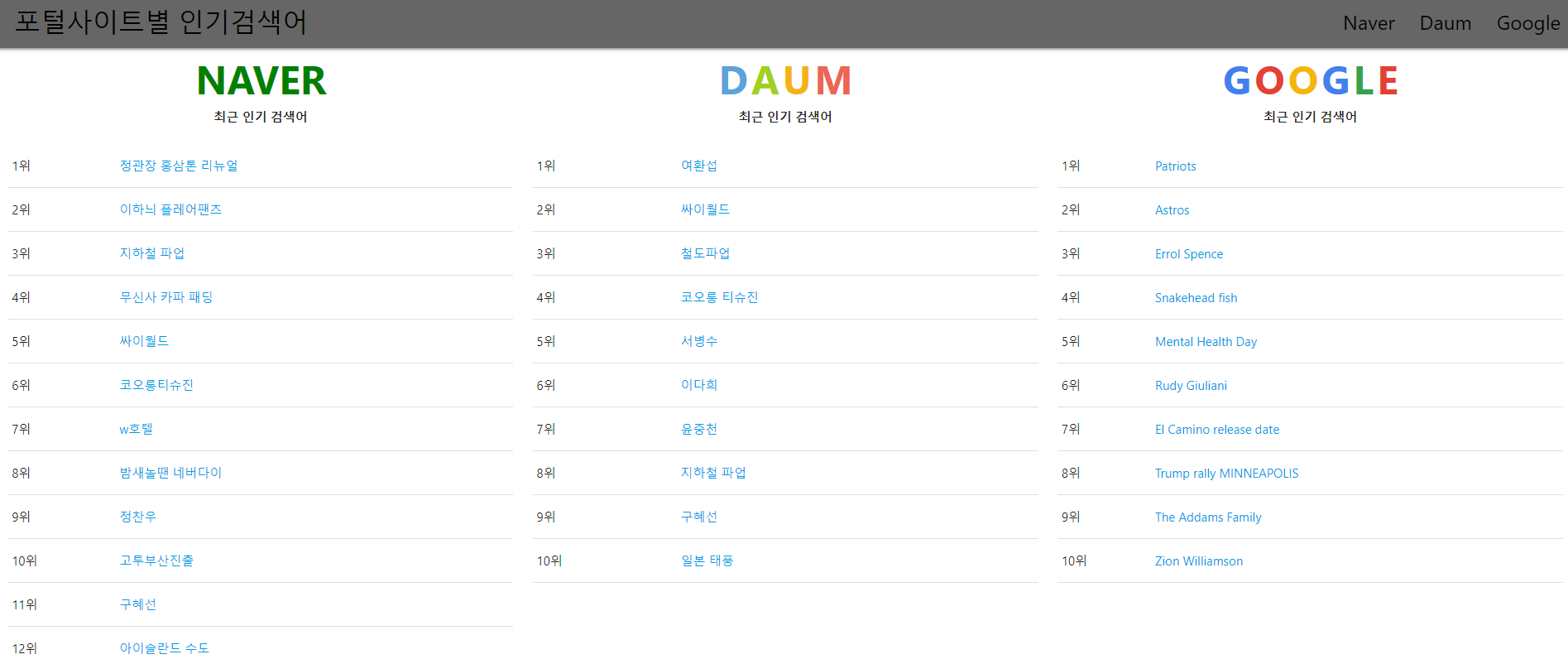 네이버, 다음, 구글의 인기검색어들을 한 페이지에서 확인 할 수 있는 웹사이트를 만들고자 시작한 프로젝트입니다.