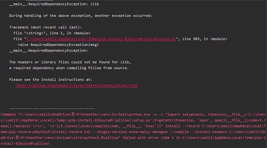 최근에 데스크탑과 노트북에 환경을 세팅하는데 Pillow 를 설치하는데 계속 위와 같은 오류가 발생했습니다.