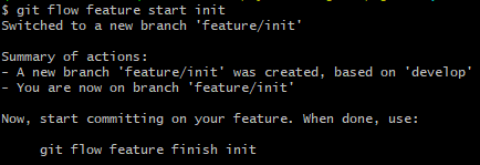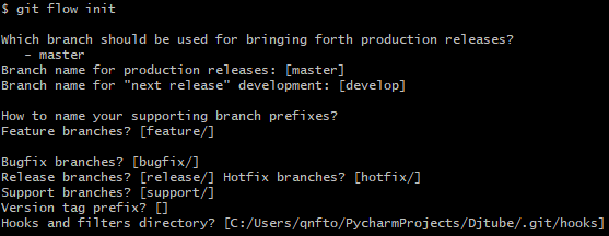 git flow init 을 타이핑 한 뒤 나오는 항목들을 디폴트 값으로 설정해주면 됩니다.