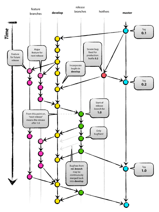 Vincent의 branching model은 feature – develop – release – hotfixes – master 단계로 branch를 나눠서 코드를 관리하는 전략이다.