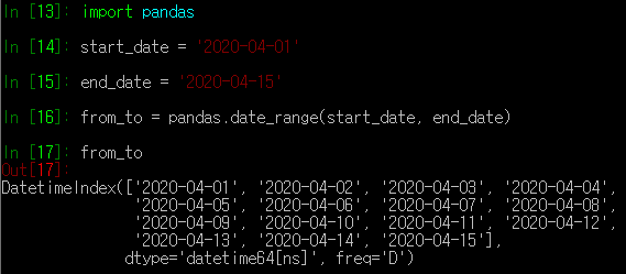 from_to = pandas.date_range(start_date, end_date) # 2020-04-01 ~ 2020-04-15 까지의 기간