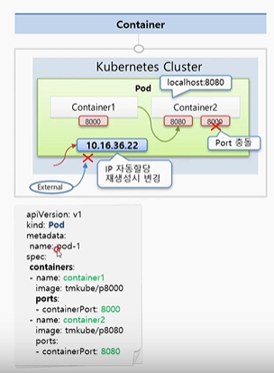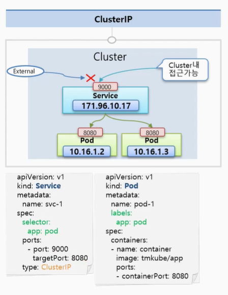 Pod가 생성될 때 고유의 IP주소가 할당이되는데 쿠버네티스 클러스터 내에서만 이 IP를 통해서 Pod를 접근할 수 있다.