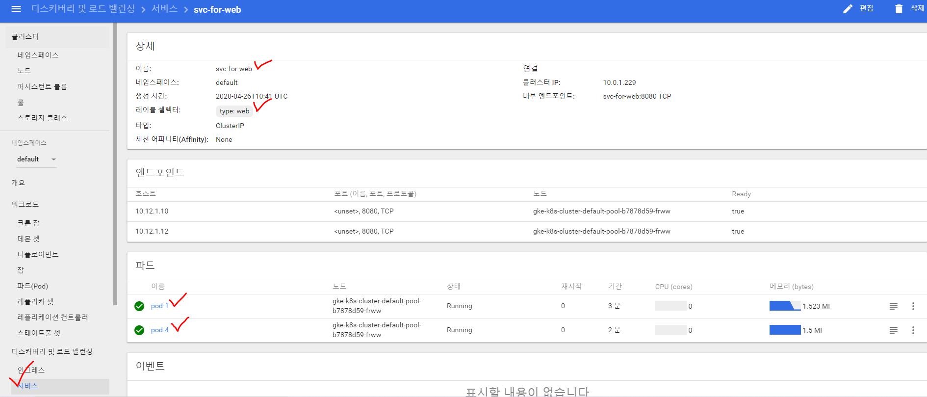 Service에 파드 부분을 보면 type이 web인 파드들을 포함하고 있는 것을 확인할 수 있습니다.