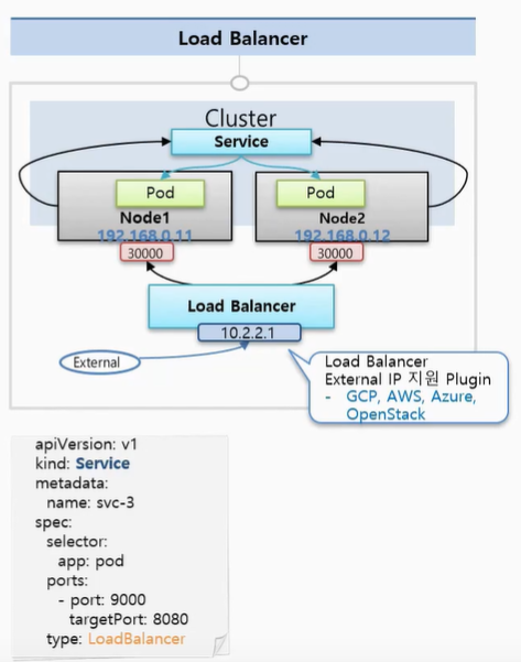 - 특징이 물리적인 호스트에 아이피를 통해서 Pod에 접근을 할 수 있다는 것인데 대부분 호스트IP는 보안적으로 내부망에서만 접근할 수 있게 구성하기 때문에 NodePort는 클러스터 밖에는 있지만 그래도 내부망 안에서 접근을 할 때 쓰인다.