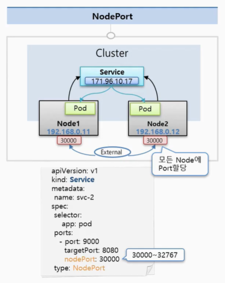 - 쿠버네티스 클러스터에 연결되어있는 모든 노드에게 똑같은 Port를 할당하여 외부로 부터 어느 노드건 간에 IP의 포트로 접속하면 이 서비스에 연결이 된다.