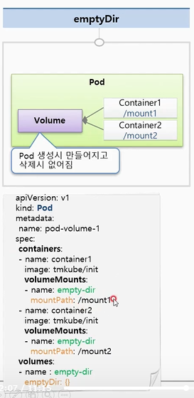 최초 Volume을 생성 할 때 공간이 비어져있기 때문에 emptyDir이라고 이름이 지어졌다.