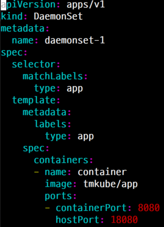 selector와 template가 있어서 모든 노드에 템플릿으로 팟을 만들고, 셀렉터와 라벨로 데몬셋과 연결됩니다. nodeSelector로 특정 노드의 지정한 라벨에만 생성하게도 설정해줄 수 있습니다.