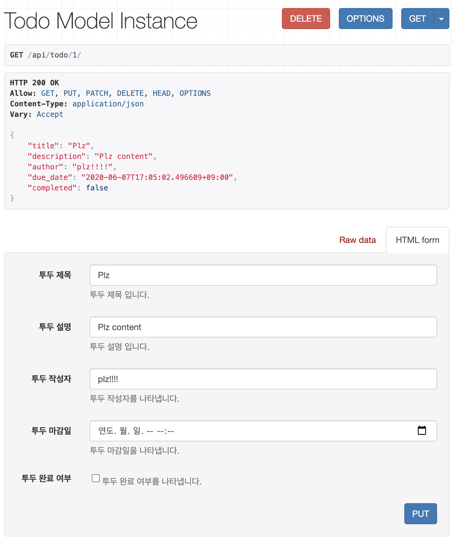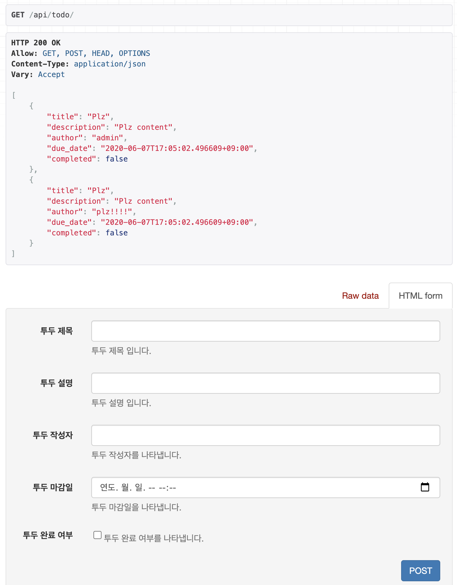 이건 해당 폼을 입력하고 POST /ap/todo/ 로 요청을 보내면 내용이 DB에 저장되는 것을 말합니다.