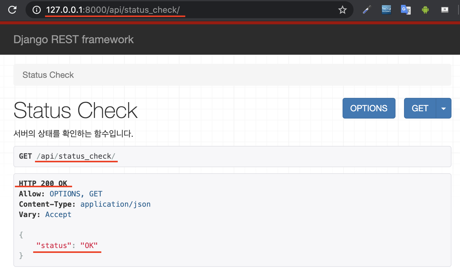 위 코드는 /api/status_check/ 로 요청을 받으면 status_check라는 뷰를 실행하라는 것이고, status_check 에서는 서버에 이상이 없다면 Response로 "status": "OK" 와 200 코드를 요청한 사람에게 돌려줍니다.