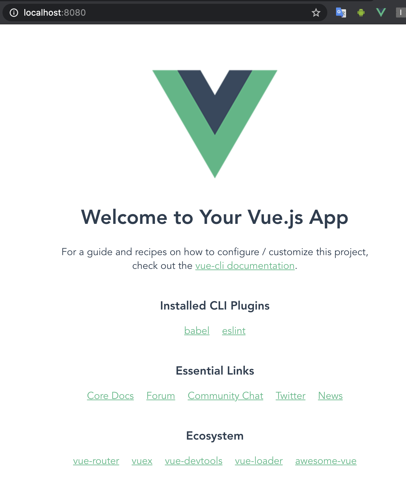 localhost:8080 으로 접속하니 Vue의 기본화면 페이지가 보이고 있습니다.