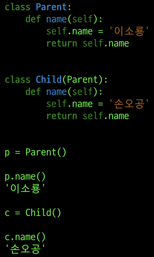 - 부모 클래스의 메소드를 무시하고, 자식 클래스에 새롭게 정의 된 메소드를 사용하게 됩니다.