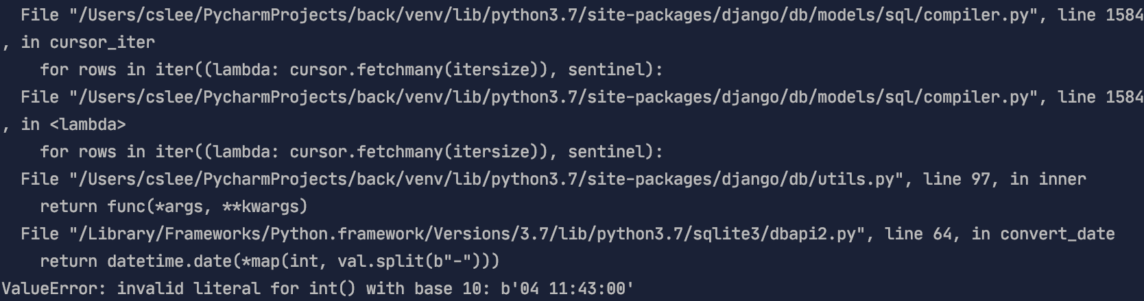 왜 오류가나는지 찾아보니 due_date의 형식이 다르다는 것 입니다. DatePicker 로 생성한 데이터를 보면 2020-08-04 와 같은 포맷을 나타내고 있는데 백엔드 서버에서는 DateTimeField 라서 날짜와 시간을 다 받으려 하기 때문에 오류가 발생한 것 입니다.