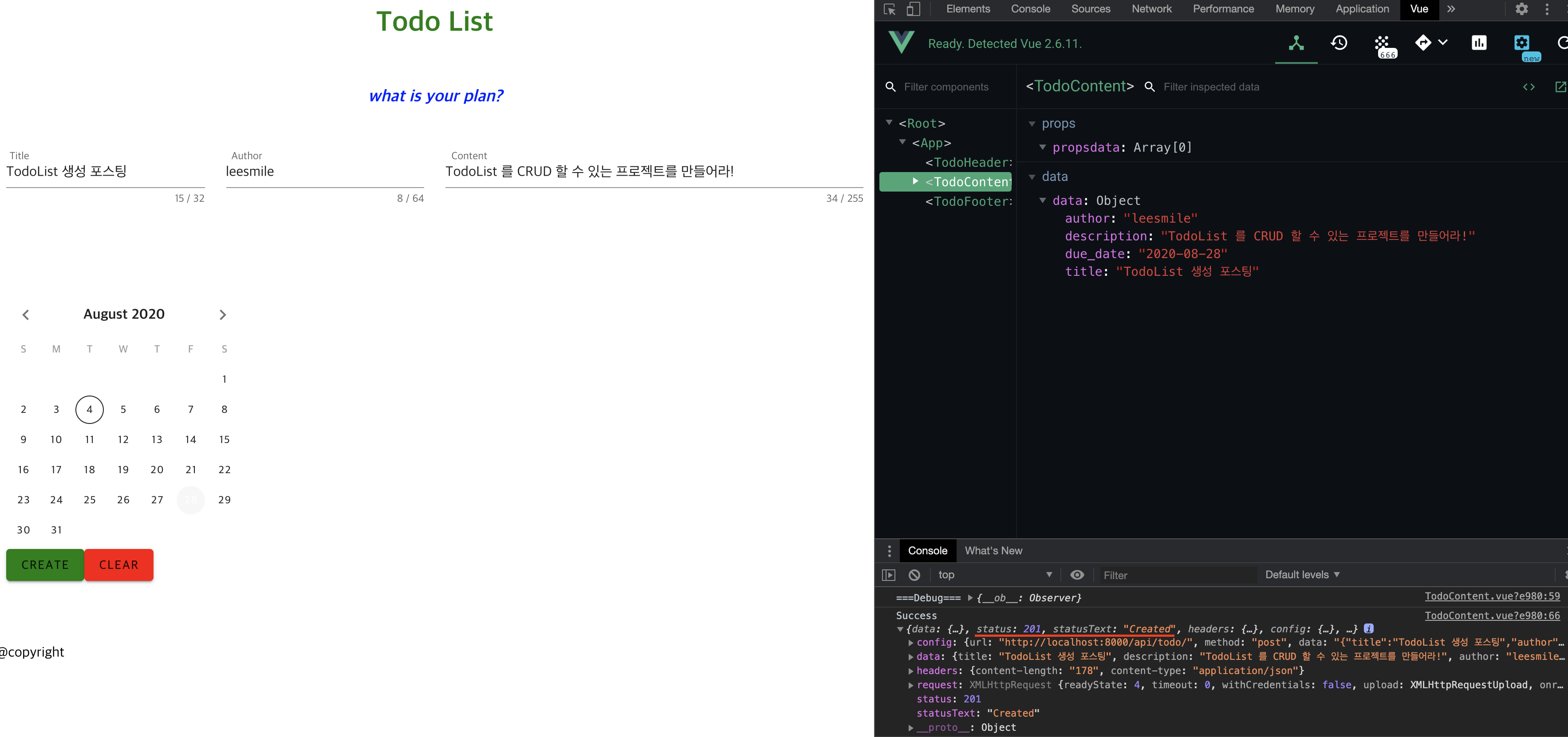 구현하기 전에 제가 생각한 Create 방법은 자식 컴포넌트(TodoContent.vue) 에서 부모 컴포넌트(App.vue) 에게 입력한 데이터를 전달하여 모든 요청응답은 App.vue 에서 하는게 어떨까 라는 생각과 자식 컴포넌트에서 바로 입력한 폼의 요청을 백엔드 서버로 보내는 방법 중에 고민을 했습니다. 정확하지 않지만 알아본 결과 EventBus 가 많으면 좋지 않다 라는 것을 확인하고, 자식 컴포넌트에서 받은 폼을 바로 백엔드 서버로 전송하는 것으로 방향을 잡았습니다. (Vue.js 를 공부하면서 포스팅을 하기에 확실한 정보가 아닐 수 있습니다. 피드백은 환영입니다. *^^*)