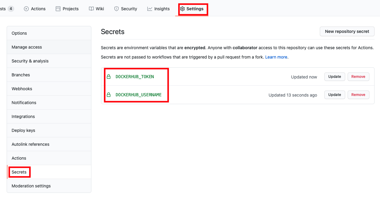 여기서 ${{ secrets.DOCKERHUB_USERNAME }} 안에 보시면 secrets는 Github 레포지토리에서 생성하는 secrets을 가져와 사용하는 것 입니다. Github settings -> Secrets로 이동해 USERNAME과 TOKEN을 입력해주도록 하겠습니다.