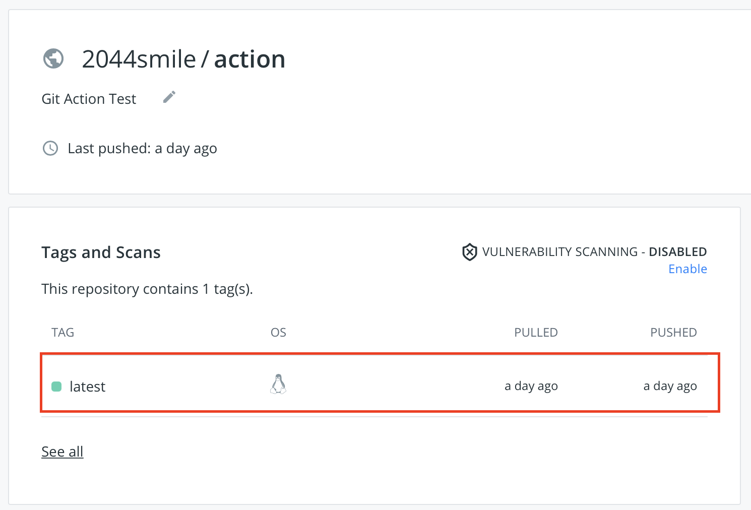 마지막으로 docker push 명령어로 `docker push 2044smile/action:latest` 이미지를 도커 허브 레포지토리에 Push하면 됩니다.