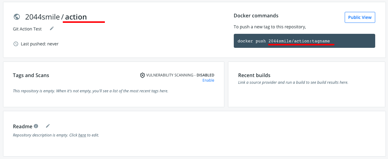 위 사진에서 Docker commands를 보시면 2044smile는 계정명이고, action은 레포지토리 이름입니다.