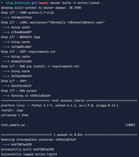 `docker build -t action:latest .` 명령어로 이미지를 빌드하겠습니다.