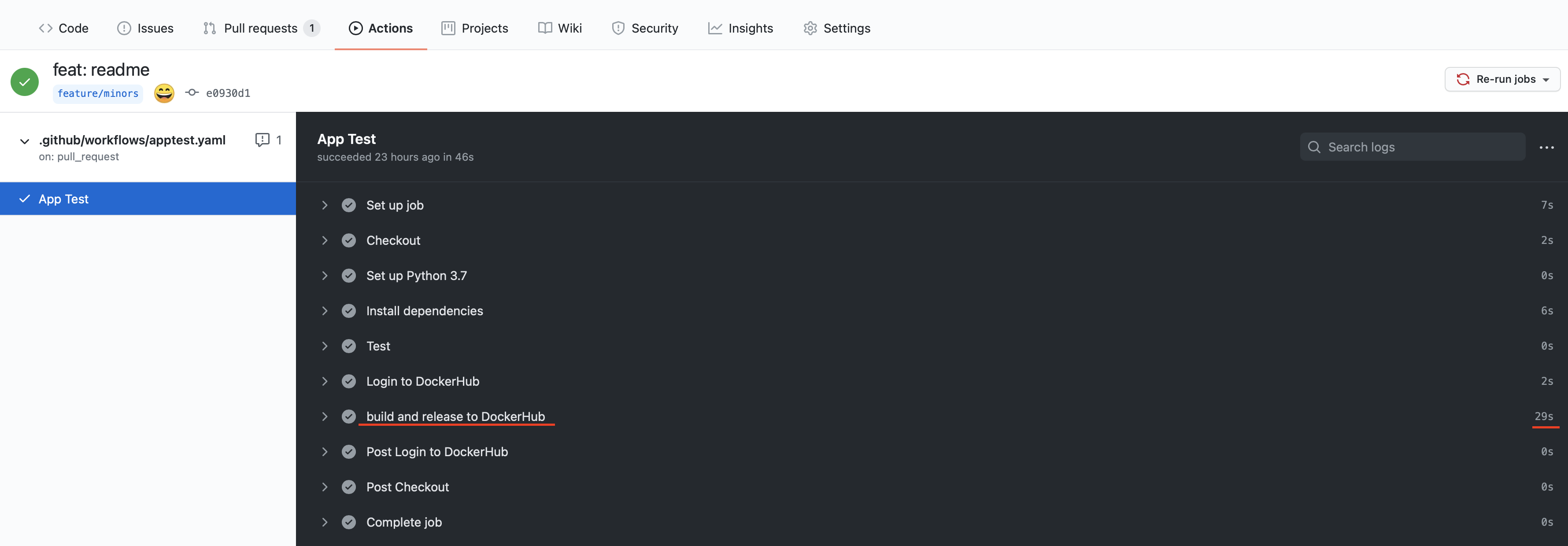 파일을 수정하고, main 브랜치에 PullRequest를 보내보면 Git Action이 동작하면서 생성해두었던 Docker Hub 이미지가 올라갑니다.