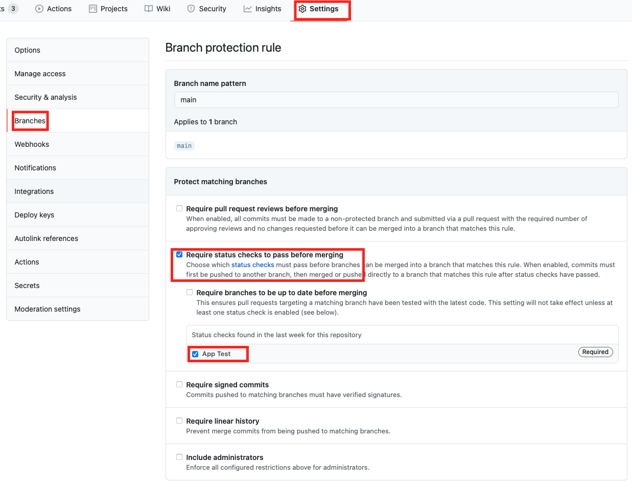 settings -> Branches -> Branch protection rules 이동 후 아래와 같이 설정해주면 됩니다.