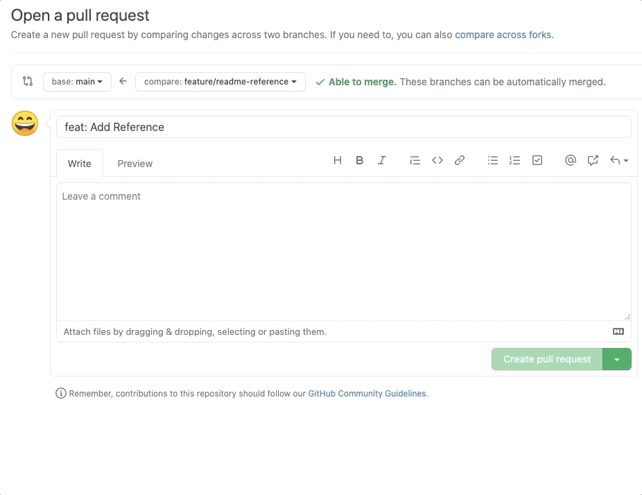 feature/readme-reference라는 branch를 만들어 Push하였고, Github로 이동하여 PR을 보내보도록 하겠습니다.