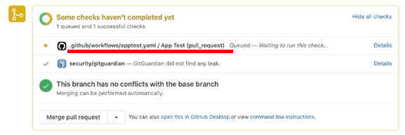 여기서 2번 동작의 경우에는 우리가 만든 Action이 다 끝나지도 않았고, 통과했는지 여부도 모르는데 Merge 버튼이 활성화 되었습니다.