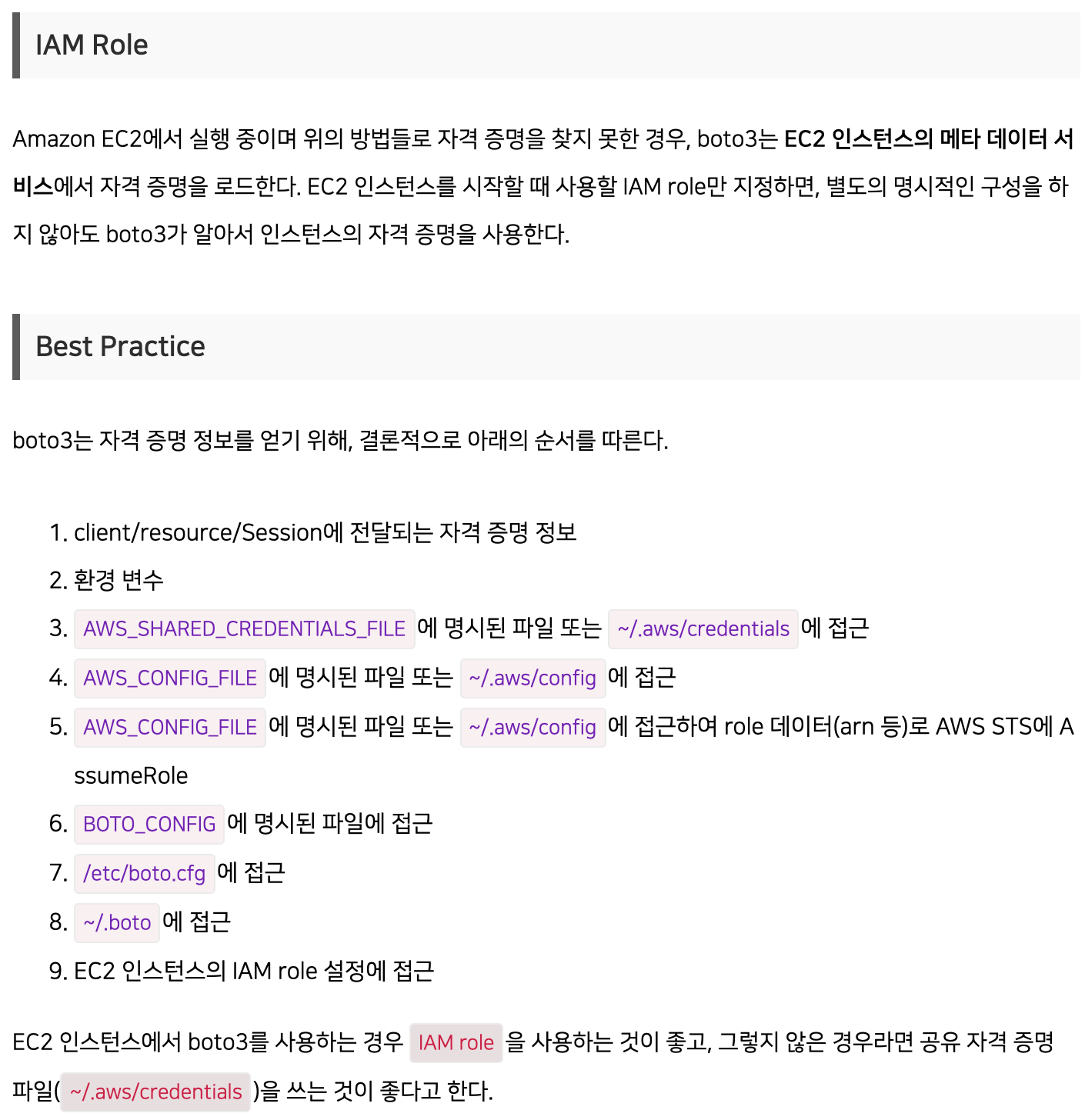 Argo Workflow에서 A 워크플로우가 Complated 된 다음 /data 경로에 생성되는 파일을 B Workflow에 /data 경로에 마운트하여 사용하고 싶었고, Argo Workflow Artifacts를 사용하여 구현하였습니다. 공식문서(링크)를 확인해보시면 AWS key를 설정하여 사용하였지만 이 글에서는 Cluster에 IAM Role과 Kubernetes Service Account를 매핑하여 사용하였기 때문에 AWS 관련 SDK인 boto3에서는 자동으로 인스턴스 안에 설정되어있는 IAM Role을 찾아 S3 권한을 갖게 되기 때문에 별도로 AWS Key 설정은 해주지 않았습니다. 이와 관련한 정보는 boto3가 자격 증명 정보를 얻어내는 구조를 설명해준 블로그에서 확인해보실 수 있습니다.