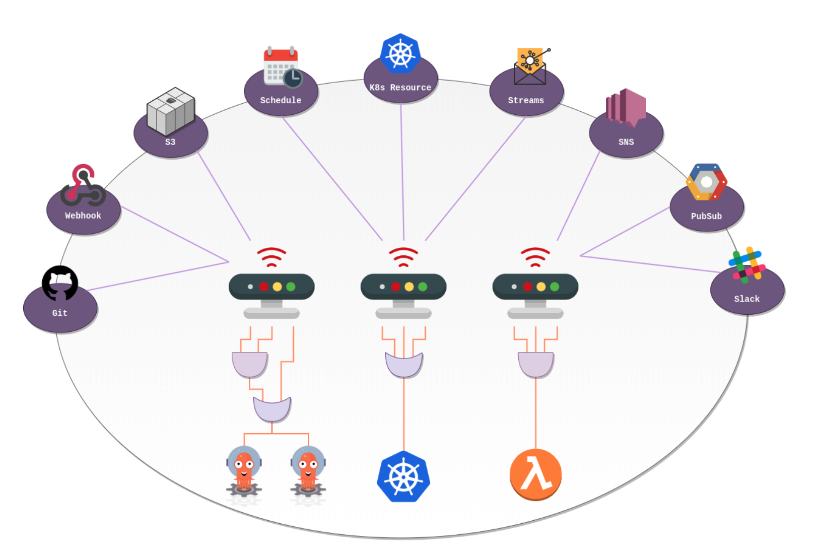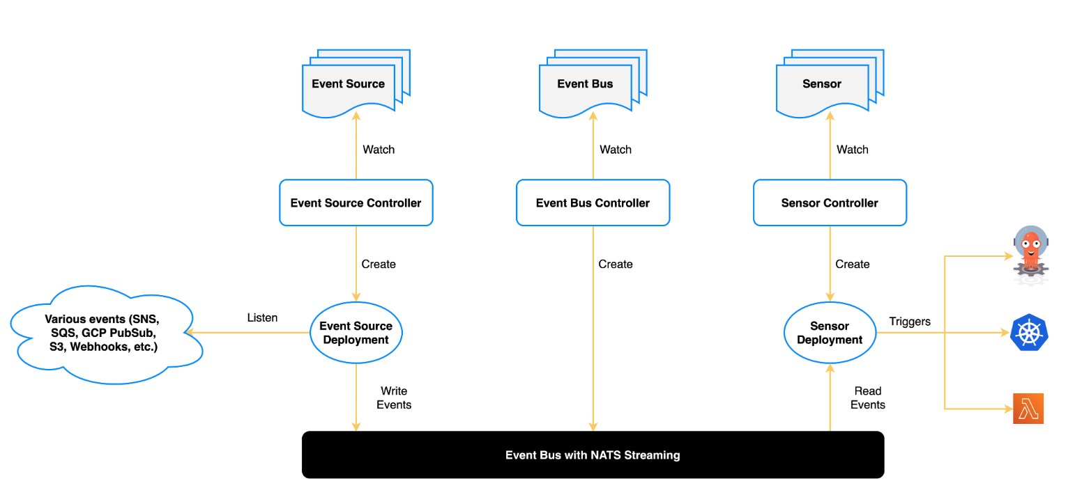 Kubernetes 개체, Argo Workflow, 서버리스 워크로드 등을 트리거하는 역할을 수행합니다.