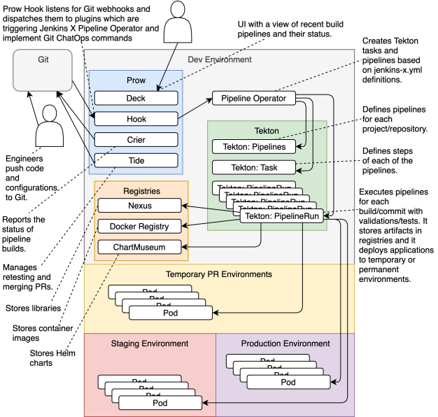 먼저 개발자가 Git Repository로 소스를 푸시한다. 특정 branch (master, develop, staging)에 푸시될 경우 Lighthouse에서 이벤트를 받아 파이프라인을 처리한다. 그 후 Tekton에서 실질적인 파이프라인을 수행하는데 그 전에 Jenkins X가 사전 작업을 수행 후 넘겨주며 Application이 배포가 된다.