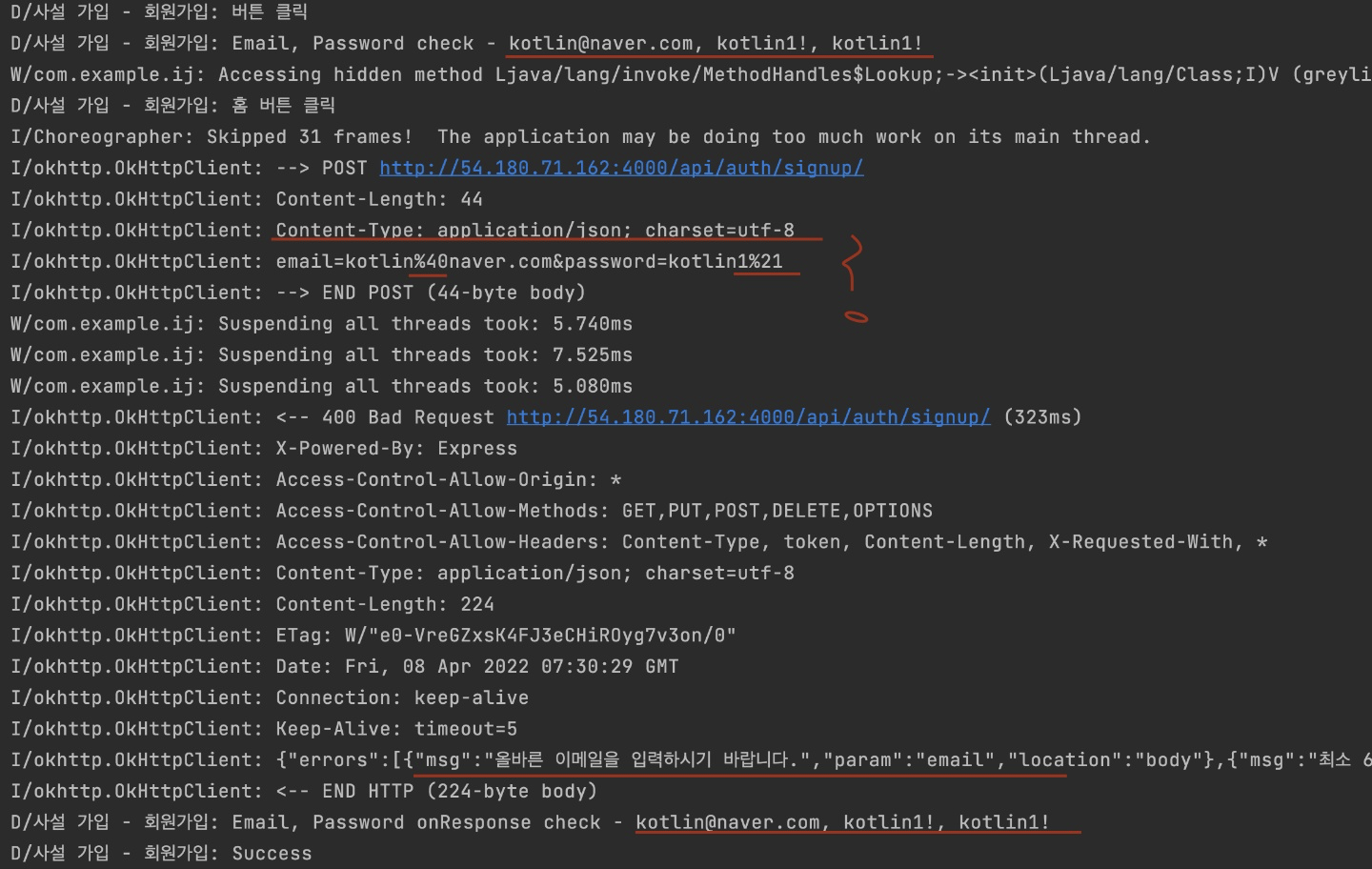 Log.d(logSignUp, "Email, Password onResponse check - ${email}, ${password1}, ${password2}")