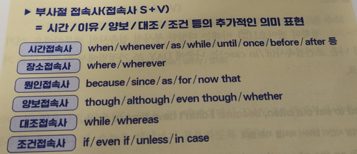 부사절 접속사: 시간/이유/양보/대조/조건 등의 추가적인 의미를 나타냄