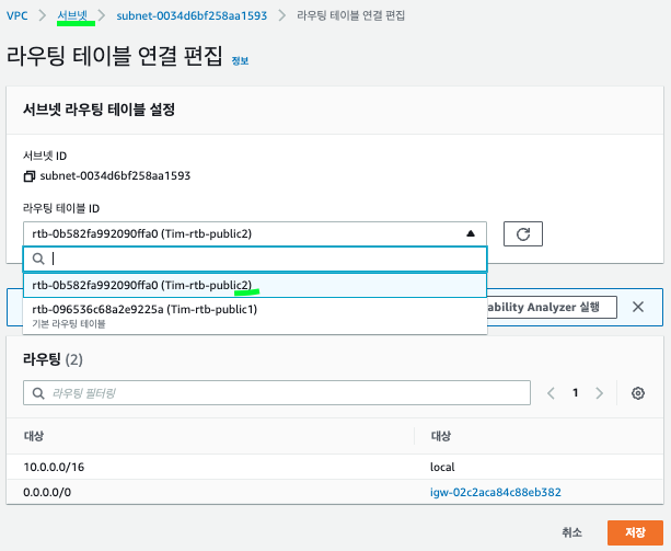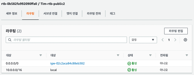 라우팅 테이블도 2개의 서브넷을 연결하여 생성되어 있습니다.