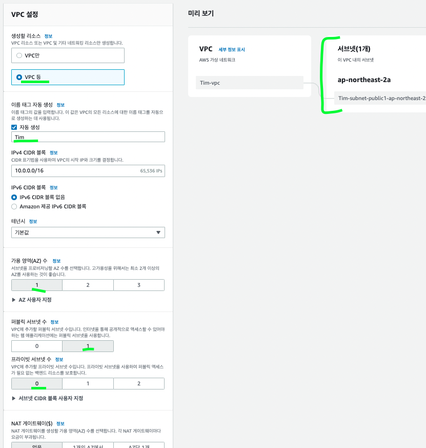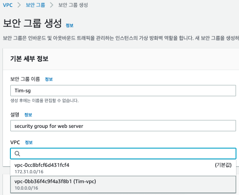 VPC 는 이번에 새로 생성한 Tim-vpc를 선택합니다.