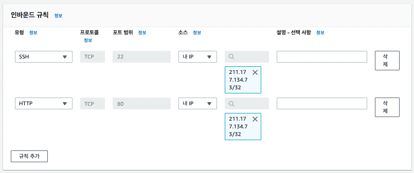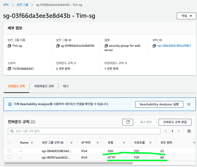 마지막으로 보안 그룹 인바운드로 22, 80번 포트를 열어놨습니다.
