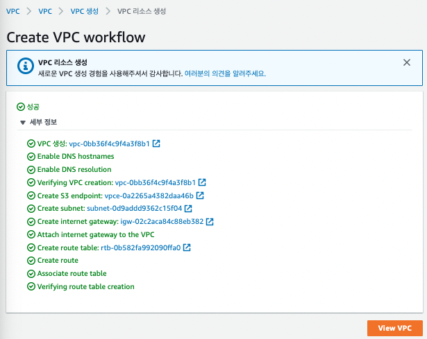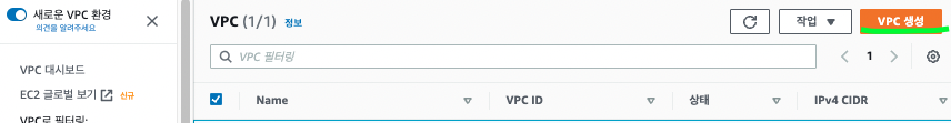 위의 과정을 잘 따라왔다면 VPC 가 한 개 생성되었고,